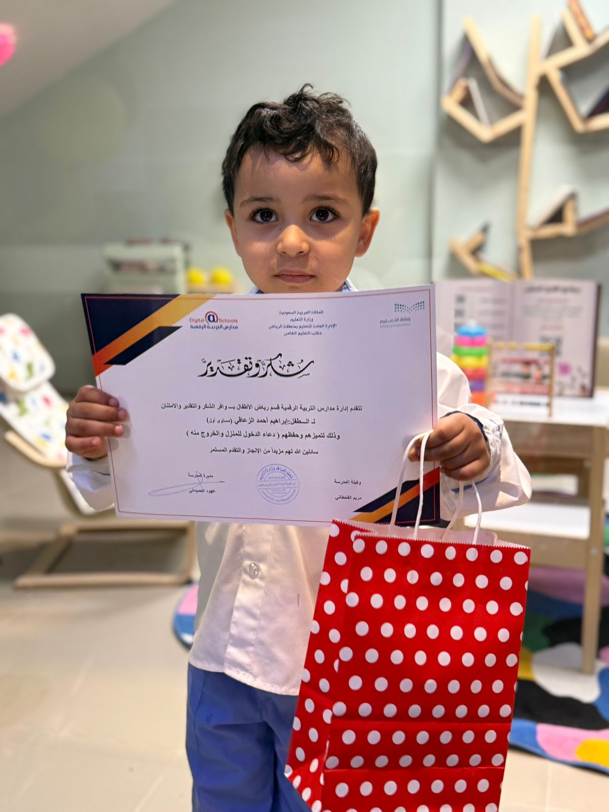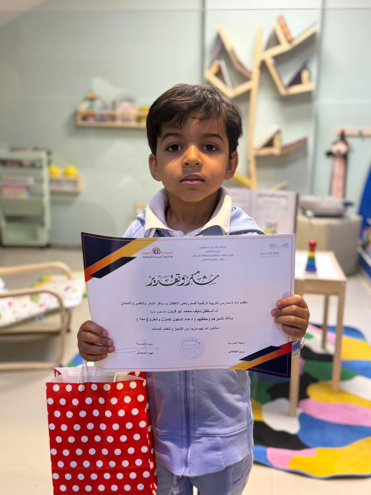 أطفال في المستوى الأول في الروضة، وذلك لحفظهم دعاء الدخول و الخروج من المنزل، بهدف تحفيزهم على حفظ الأدعية، وتقديرًا لهذه الجهود..