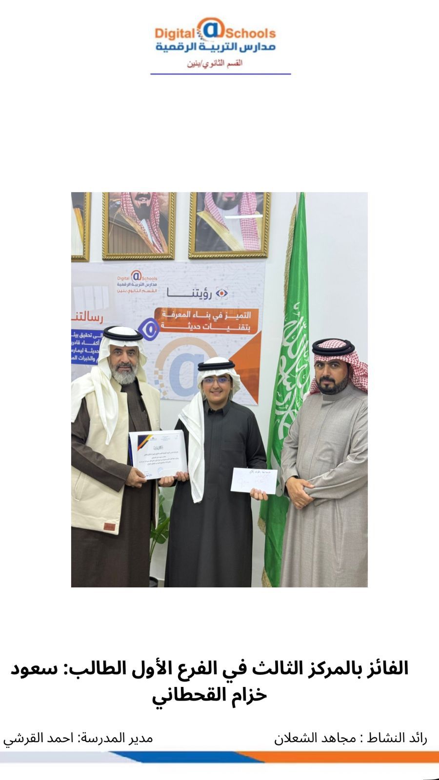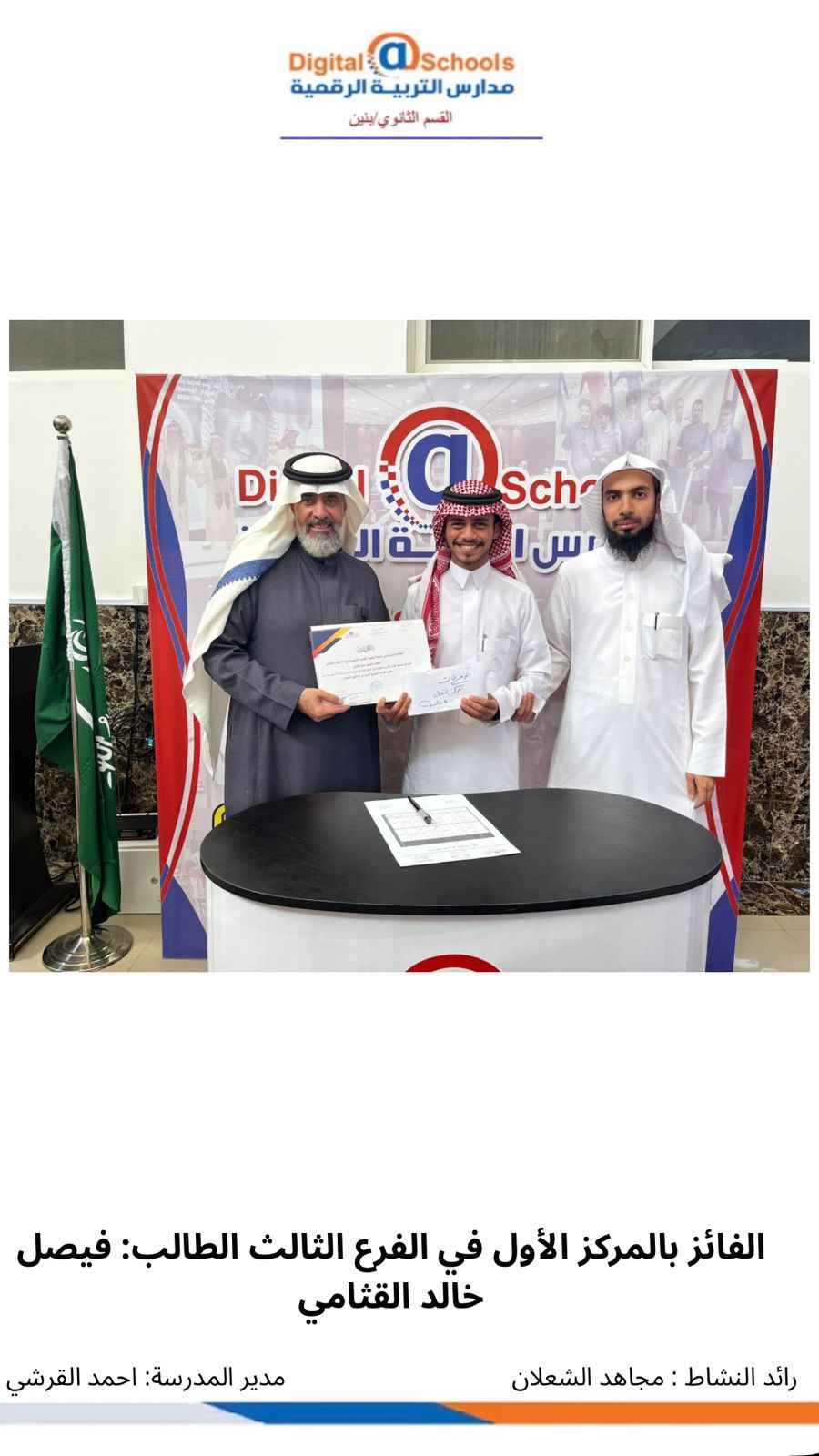 كرّم القسم الثانوي الطلاب الفائزين في مسابقة القرآن الكريم، وذلك يوم الثلاثاء 18 / 6 / 1447هـ، والتي أُقيمت على ثلاثة فروع: فرع حفظ نصف جزء عم، وفرع حفظ جزء عم كامل، وفرع حفظ خمسة أجزاء، وذلك تقديرًا لجهود الطلاب وتشجيعًا لهم على الإقبال على حفظ كتاب الله وتعزيز روح التنافس الإيجابي بينهم.