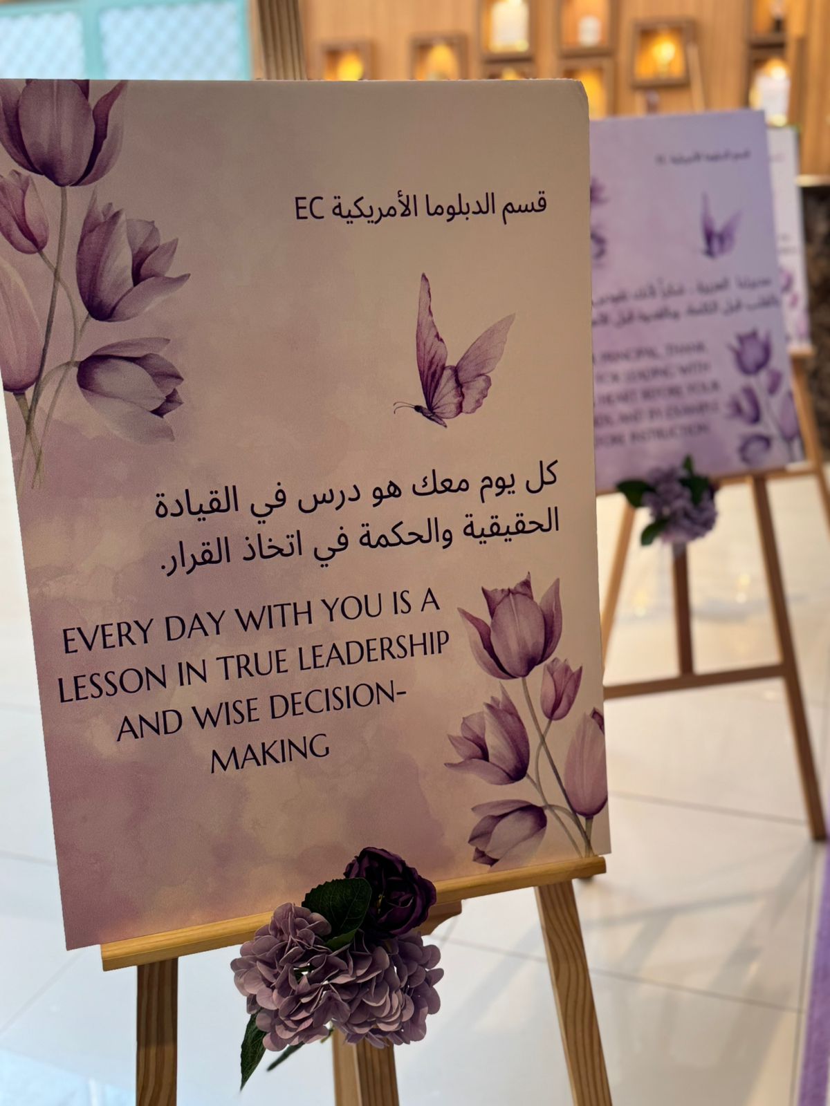 قسم الدبلوما الأمريكية EC بيوم المدير العالمي تقديراً لمديرتنا التي تبذل الجهد والعطاء بلا حدود، تقودنا بحكمة وتلهمنا بروحها الإيجابية، فكانت القدوة والداعمة الأولى لكل نجاح نحققه ، شكراً لك مديرتنا الغالية على ما تقدّمينه من تفانٍ وحرصٍ دائم على تميز الفريق وتقدمه